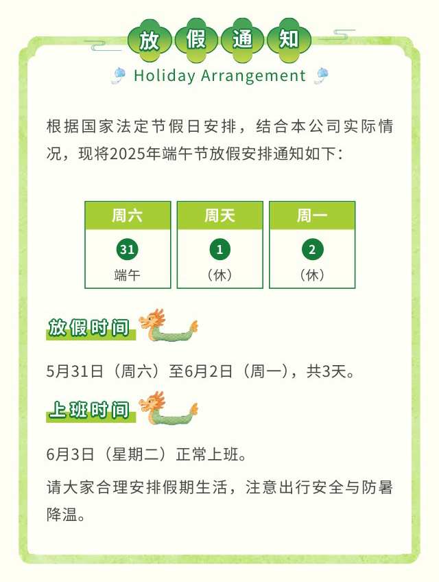 粽叶飘香,龙舟竞渡。值此端午佳节,公司向全体员工及家人致以最诚挚的祝福:愿您端午安康,万事顺遂!感谢每一位伙伴的辛勤付出,让我们继续携手同行,如龙舟般齐心协力,共创美好未来!