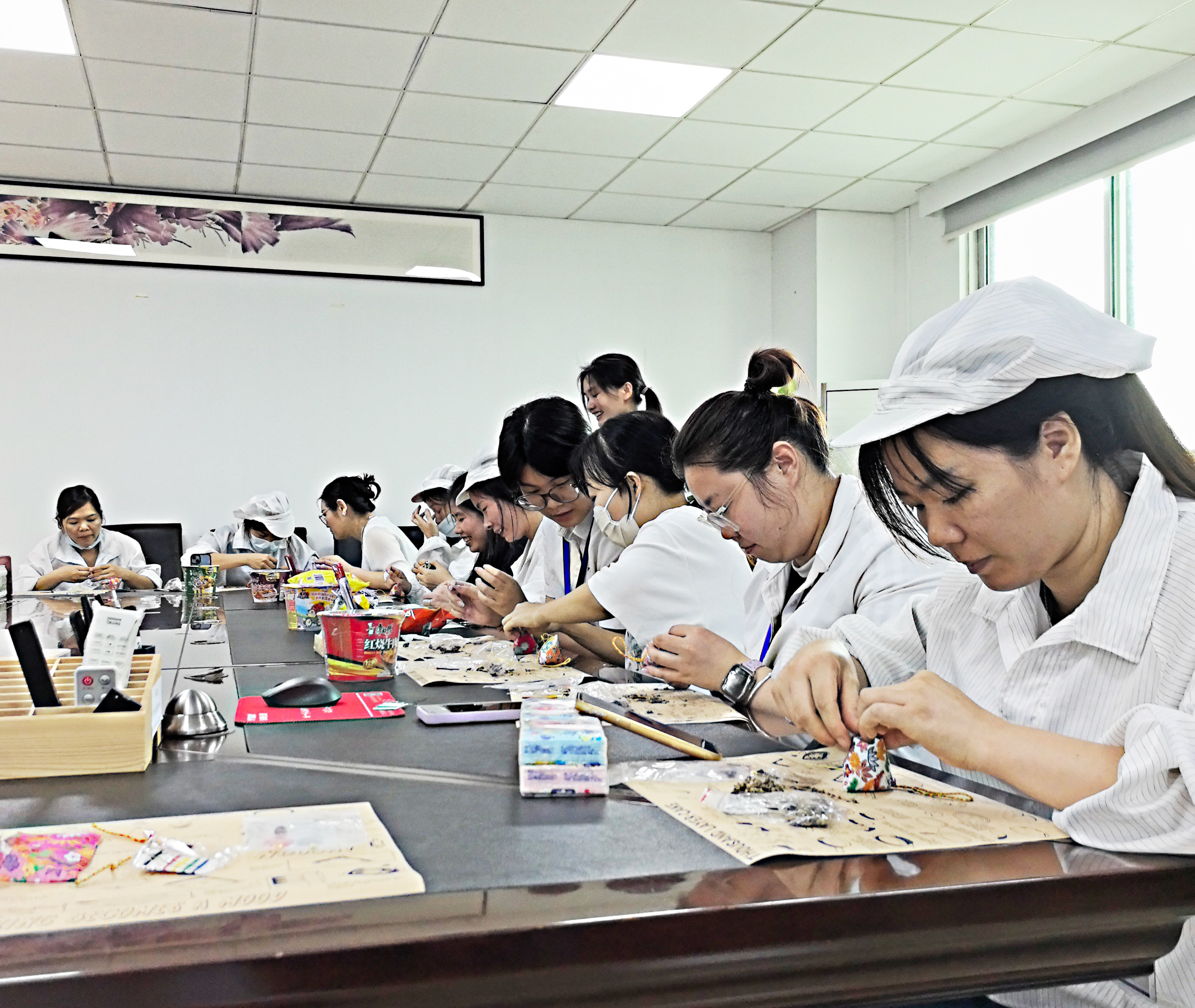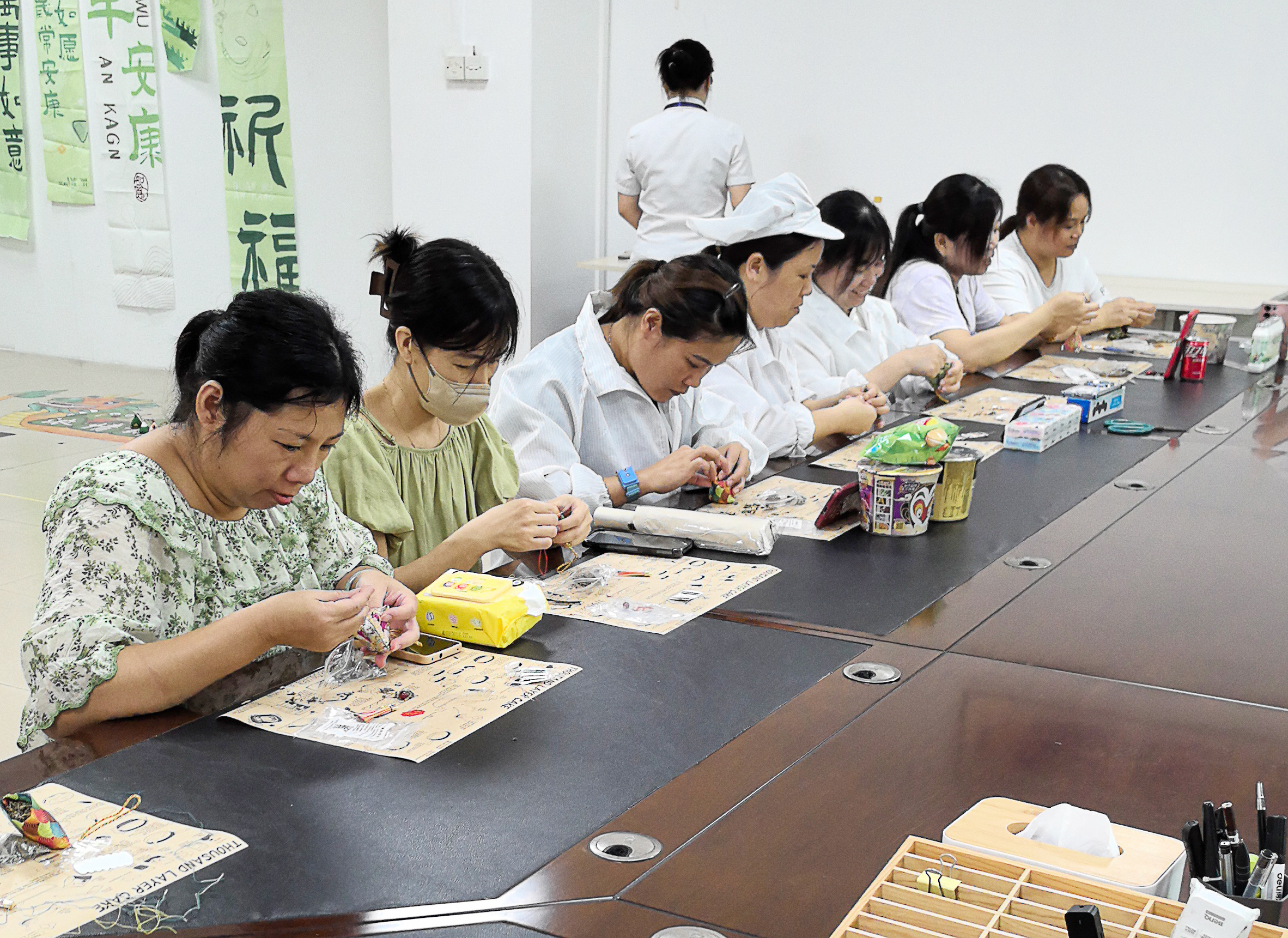同仁们专注穿针引线,清幽药香中传递文化薪火,方寸香囊承载着对健康平安的美好期许。