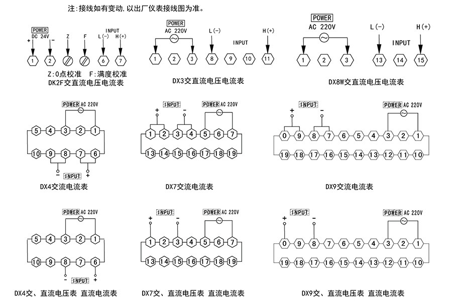 注:DX3/DX8 DC24V供电需订做。DX2F交流电流量程只做交流2A以下,交流5A以上需特殊订做 |