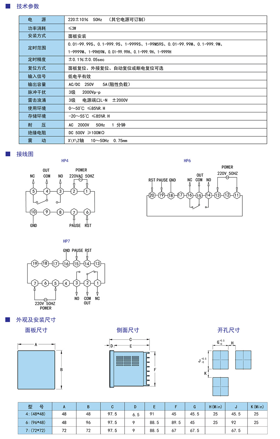 双排四位高亮度LED显示。 定时精度高。 具有停电记忆功能。 多种尺寸可供选择。 多种输出延时功能模式通过菜单可选。 经过严格的EMC及可靠性测试。 具有十进制、百进制、六十进制计时功能。 具有暂停、复位功能。