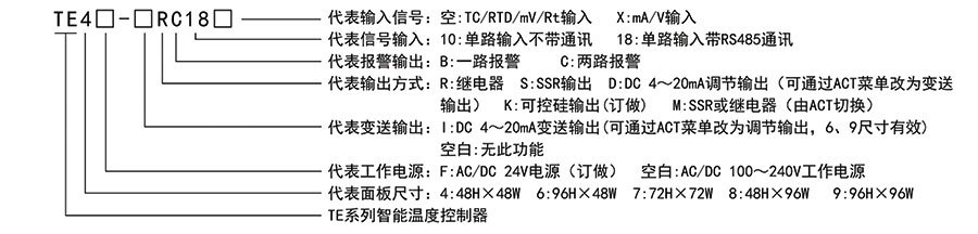 产品型号 | 0UT1主控输出 | 报警输出 | 变送电流 | 通讯 | 辅助电源 | 编码 | ||||