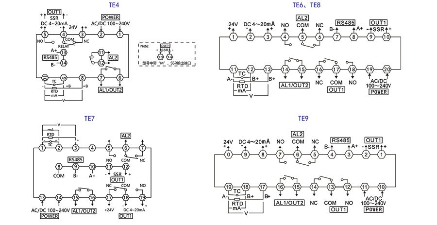 RELAY | SSR | 4~20mA | AL1 OUT2 | AL2 | AL3 | 4~20mA | RS485 | 24V | ||