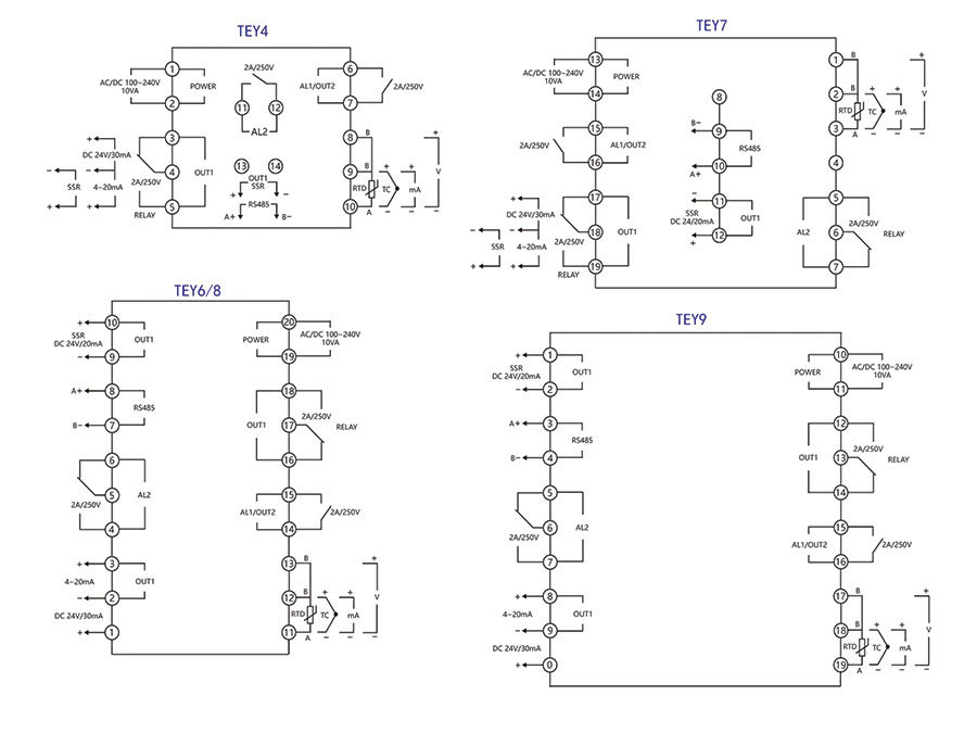 RELAY | SSR | 4~20mA | AL1 OUT2 | AL2 | AL3 | 4~20mA | RS485 | 24V | ||