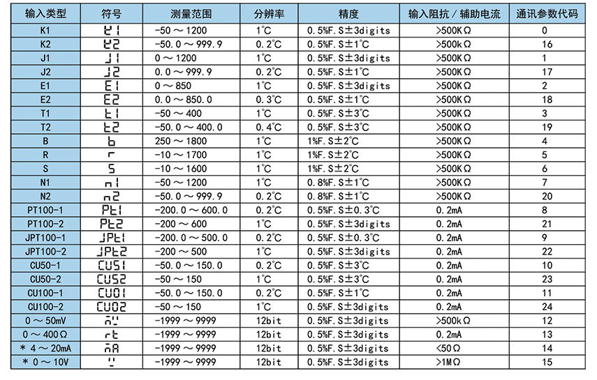 □:确省“空”输入信号为TC/RTD/mV/Rt;选“X”输入信号4~20mA/0~10V ●:标准配置功能 ◎:有此功能但与其他功能复用,本系列控制器只有一路D0 4~20mA输出但可以通过ACT菜单配置用于主控输出或变送输出。 |