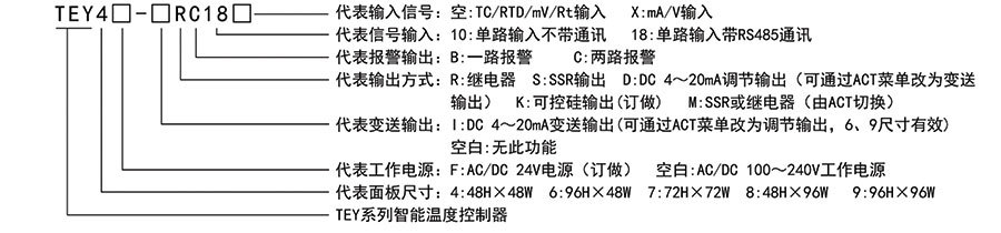 产品型号 | 0UT1主控输出 | 报警输出 | 变送电流 | 通讯 | 辅助电源 | 编码 | ||||