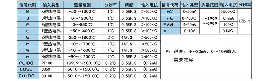 型号 | 程序段 | 控制输出 | 报警点数 | 变送输出 | 通讯功能 | 编码 |