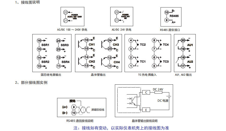型号 | 输入 | 输出 | AU1,AU2辅助报警 | RS485 | 供电电源 | 编码 |