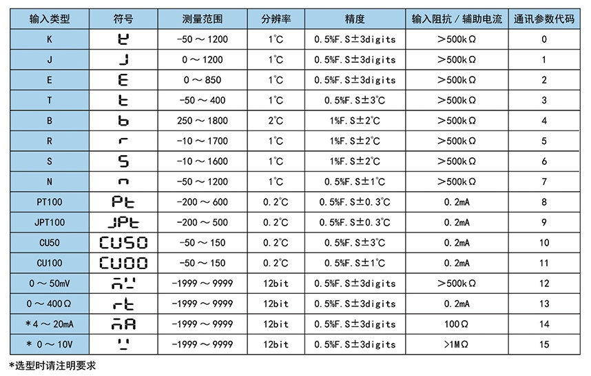型号 | 控制输出功能 | RS485 | 报警点数 | 变送4~20mA | 编码 |