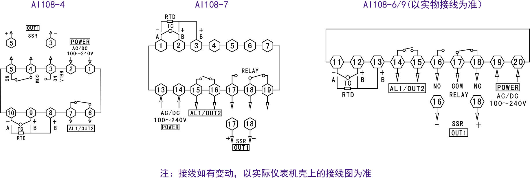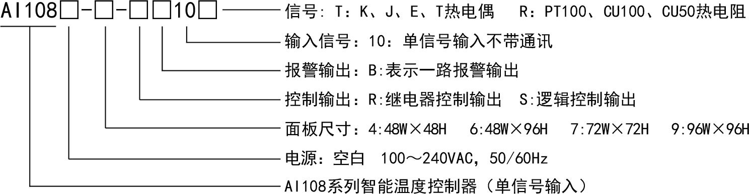 AI108-4/6/7-R/SB10-R | A版 | 4:48W×48H 6:48W×96H 7:72W×72H | 1路 | S:逻辑输出 R:继电器输出 | R:PT100、CU100、CU50热电阻 | AC/DC 100~240V | C0087AI01 |