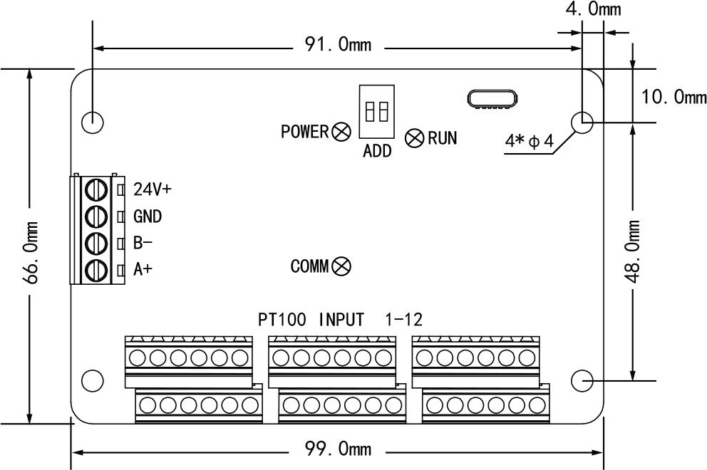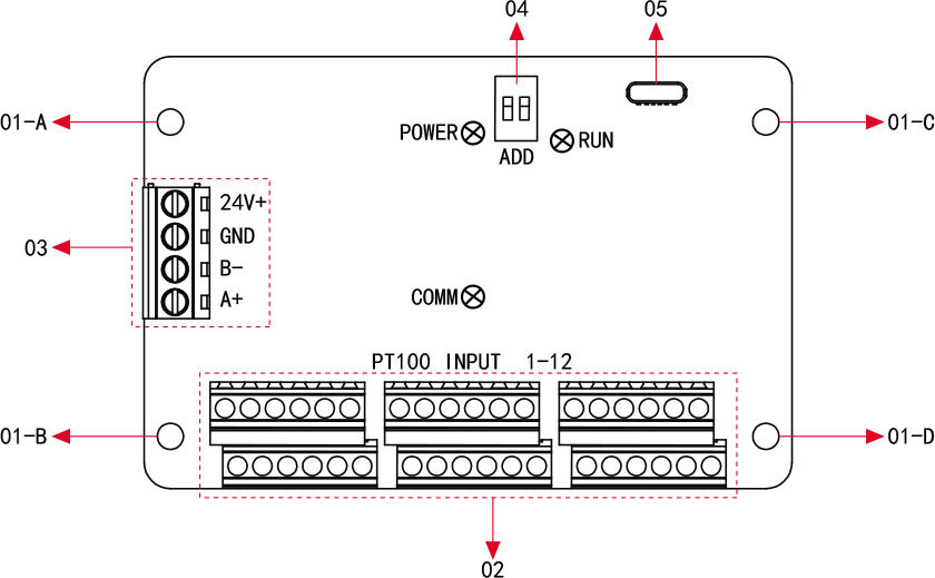 01 | 固定螺孔 | 01-A/B/C/D:四个采集板固定螺孔(φ=4) | |