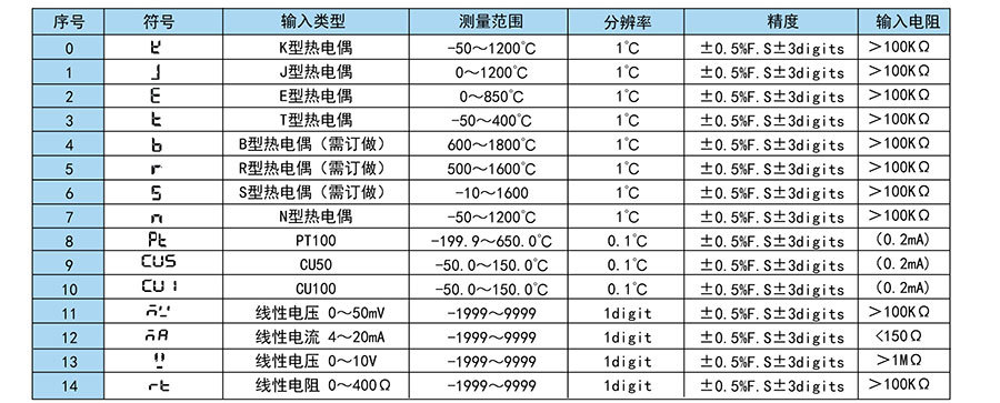 输入信 | 输入类型 | 热电偶、热电阻通用输入 标准模拟量信号输入(具体见下表) |