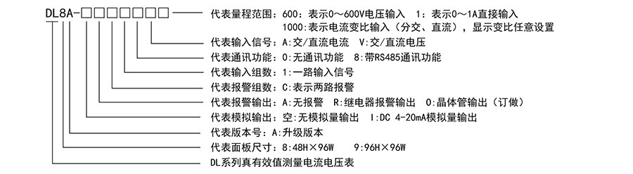 DL8/9A-RC18A1000 | 2路 | 无 | RS485 | AC0~5A、DC0~75mV二通道输入(变比显示) | B0530DL01 |