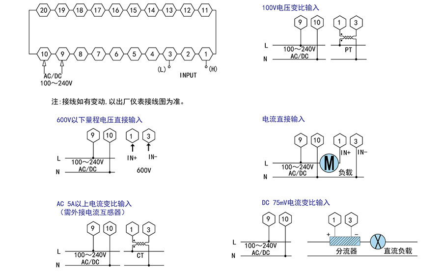注:需要测量电压大于600V时,经100V变比电压互感器变比为AC 0~100V输入,仪表显示变比值。 |